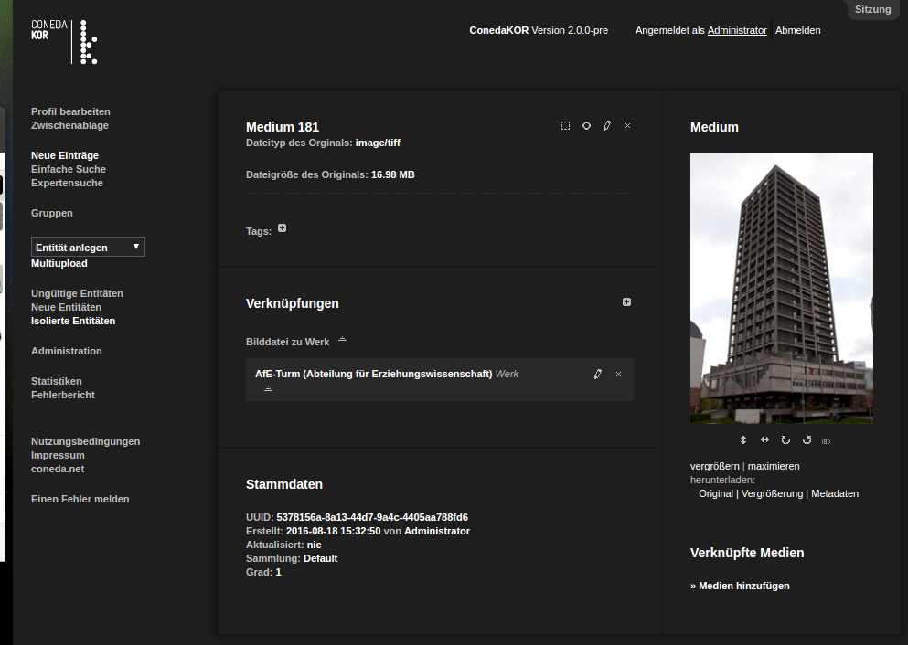 The basic idea behind this "Software as a Service"-offering (SaaS) is based on the suitability of ConedaKOR as an "in-a-box"-solution for scientific collections and archives. In addition, this tool is not only addressed to research facilities, but also university departments and professorships can use this tool to manage objects with visual media in order to make them accessible to scientists and students.