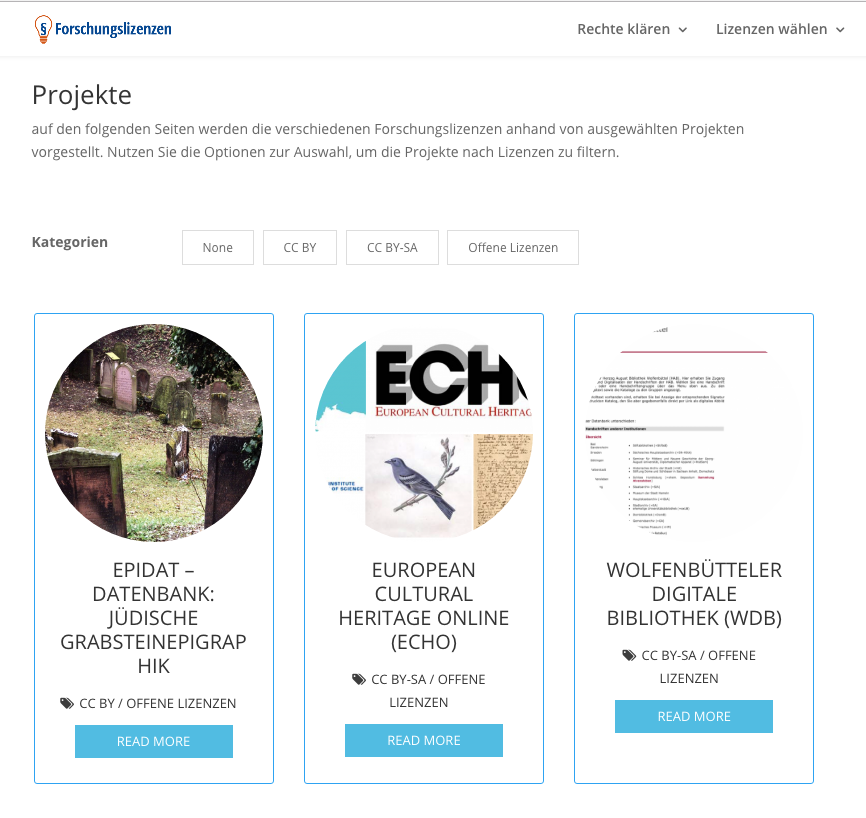 Das Portal „Forschungslizenzen.de“, das im Rahmen des DARIAH-DE-Projekts aufgebaut wurde, bietet einen Überblick zu Forschungslizenzen und stellt diese praxisnah anhand von Projekten aus den Geisteswissenschaften vor. Ziel ist es, einen Überblick zu vermitteln, AnsprechpartnerInnen zu vernetzen und den Einstieg in das Thema zu erleichtern.